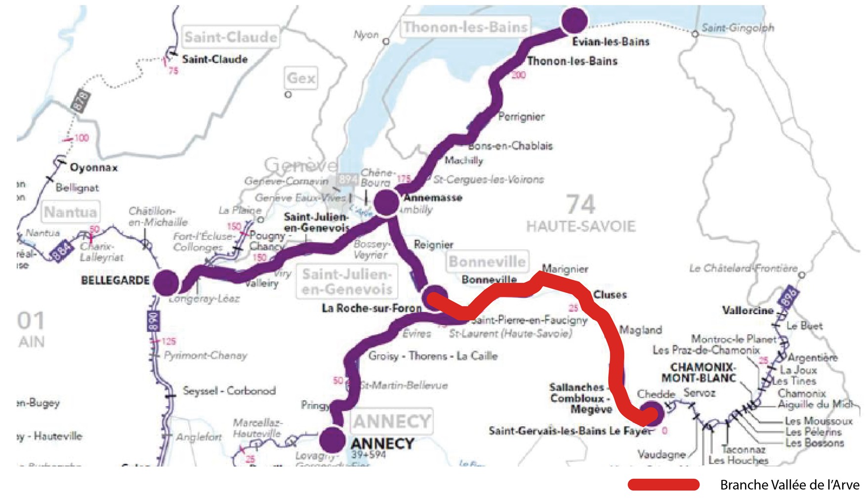 Le périmètre de l’opération : les sections de lignes 895.000 (entre La-Roche-sur-Foron et Saint-Gervais) et 897.000 (entre La Roche-sur-Foron et St-Laurent).