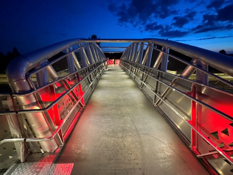 Une mise en lumière est proposée en « blanc chaud ». L’éclairage fonctionnel sécurise les circulation des usagers et la mise en lumière de l’ouvrage dévoile son architecture.