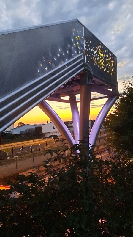 Notre projet propose une passerelle à poutres latérales en aluminium, de hauteur variable et avec un treillis triangulaire de remplissage. L’originalité architecturale du projet trouve son inspiration dans les ailes d’un papillon avec les poutres en arc légèrement inclinées de 15° vers l’extérieur et leur profil en long légèrement bombé.