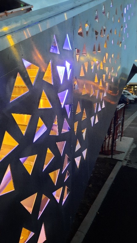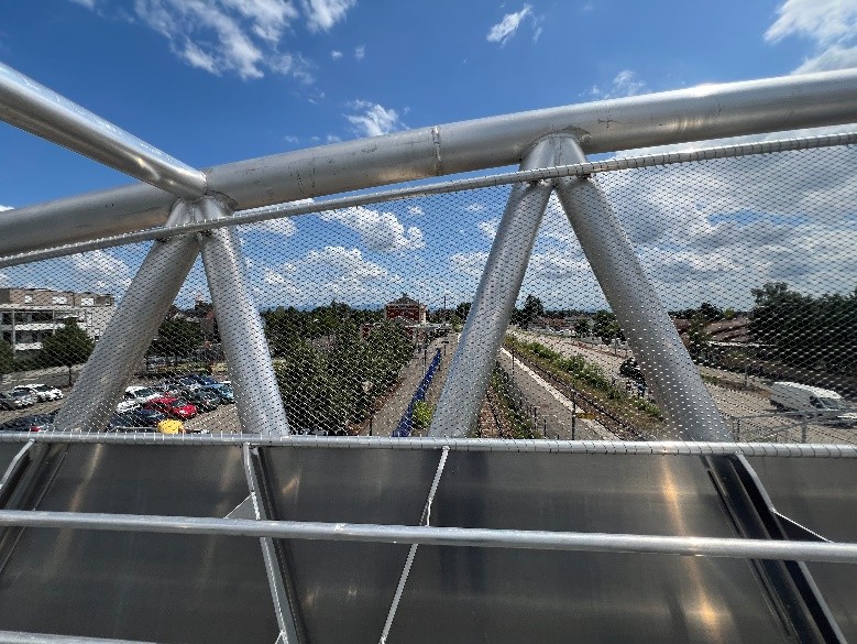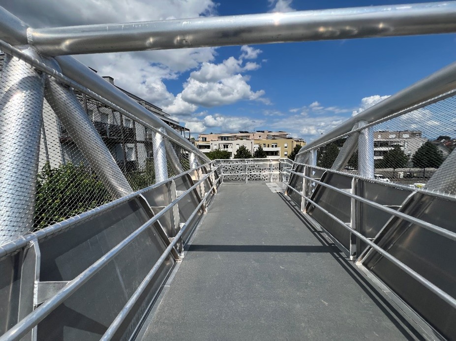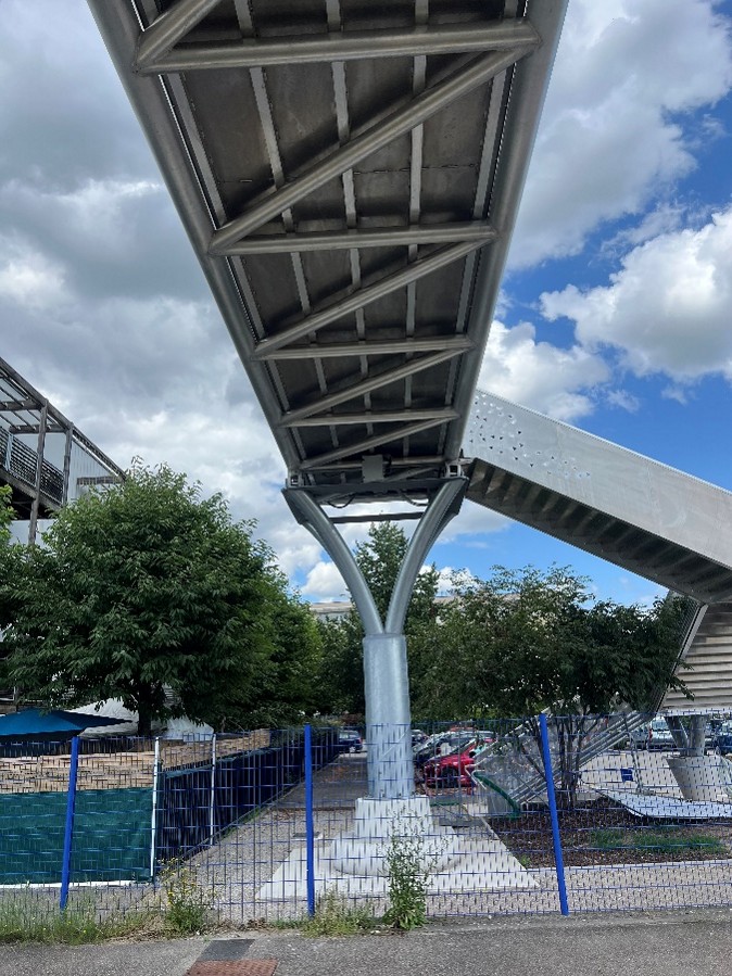Au droit de la passerelle, les garde-corps ont un remplissage en tôle pleine d’une hauteur d’1 m, surmontée d’un arc incliné à hauteur variable avec un remplissage en maille inox faisant office de protège catenaire. Au droit des escaliers, les garde-corps sont avec un remplissage en tôle découpée au laser suivant un motif inspiré de la forme des feuilles stylisées de forme triangulaire avec un jeu de dégradé pour donner un effet de perspective.
