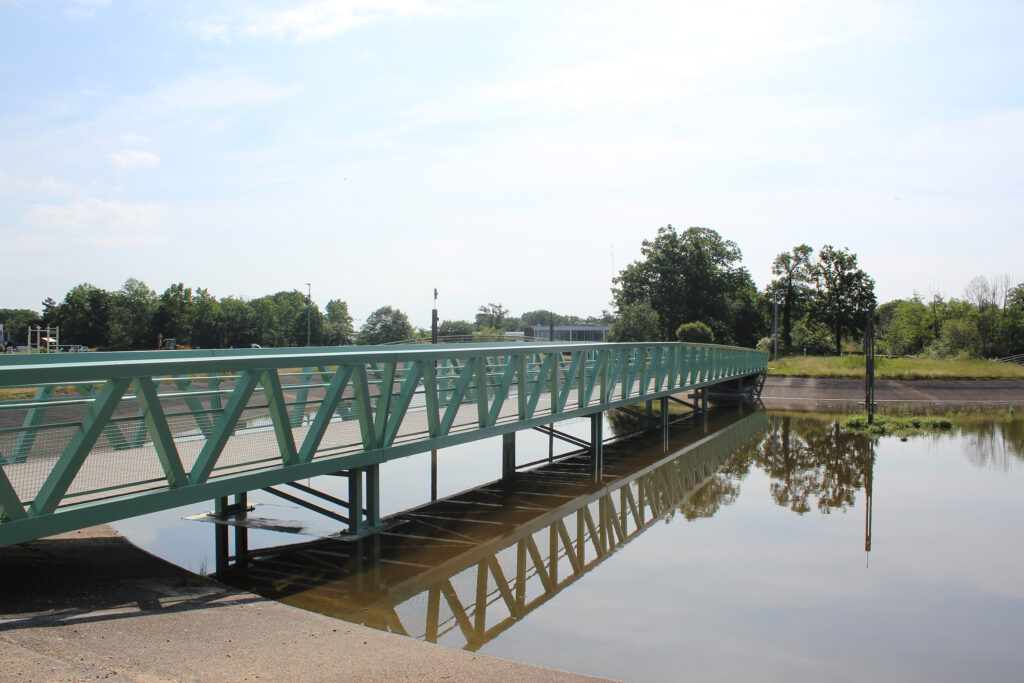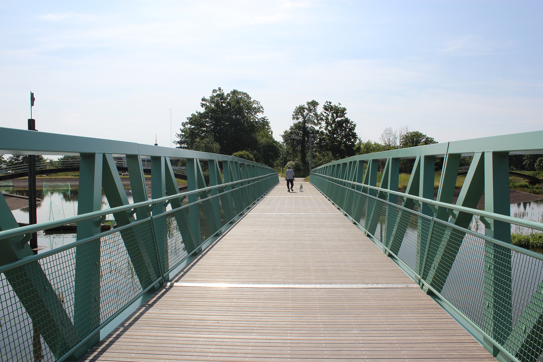 Plusieurs propositions ont été étudiées pour la nouvelle passerelle. La solution retenue est une structure métallique en aluminium à poutres latérales de 2 m de hauteur avec un profil en long légèrement bombé. L’ouvrage est d’une portée totale de 65 m sur des appuis en béton. Le tablier est d’une largeur de 3 m utile. Le tablier de la passerelle se trouve à une faible hauteur par rapport au niveau de l’eau du lac ce qui donne un aspect de ponton. La structure métallique est proposée en ton vert pâle afin de s’intégrer au site environnant et composer avec les autres passerelles existantes.