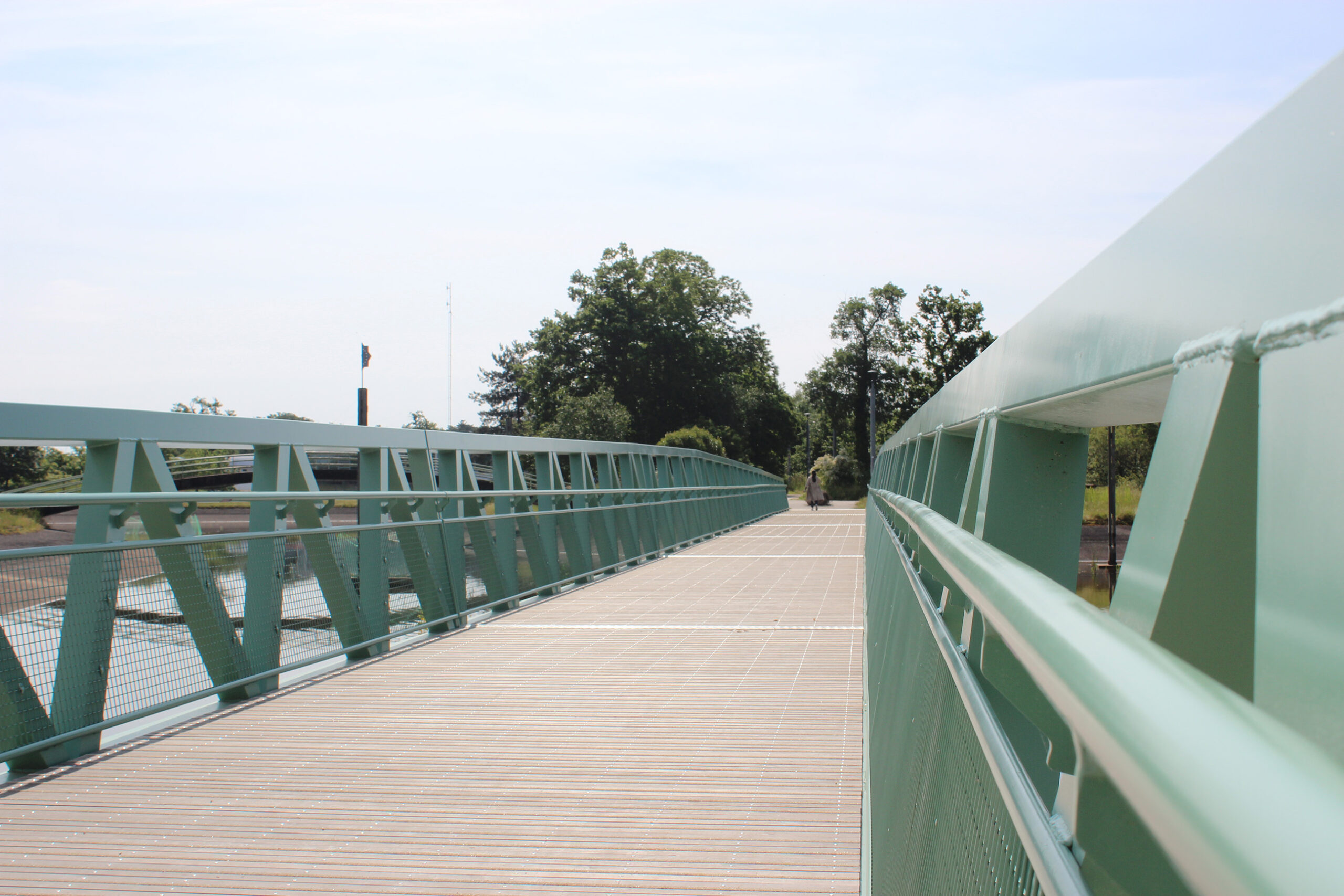 Les garde-corps sont légèrement inclinés de 10° vers l’extérieur de la passerelle avec des mains courantes en aluminium brossé fixées sur les diagonales de la structure. Les mains courantes sont à 0,90 m de hauteur du platelage. Le remplissage du garde-corps est prévu en métal déployé en ton gris clair.