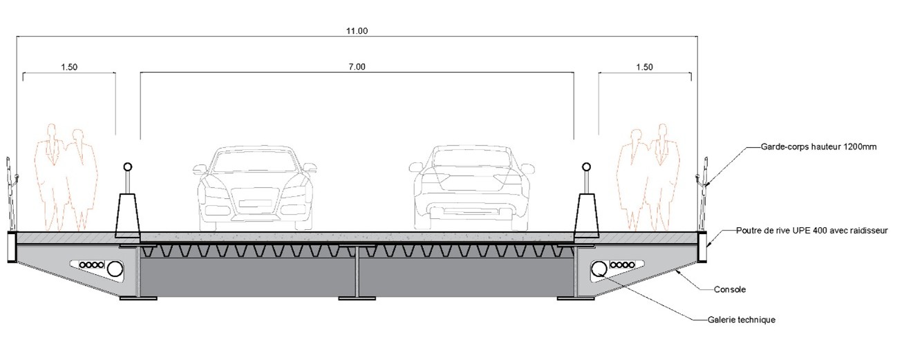 La contrainte principale du projet est le respect d’un gabarit routier important dû au passage du TCSP et la nature du transite de la RN5. Pour cela, nous avons choisi d’explorer trois systèmes structurels qui ont la particularité de limiter la retombée de poutre. Ces systèmes sont : le multi poutres, les poutres PRS latérales et le Bow-string.