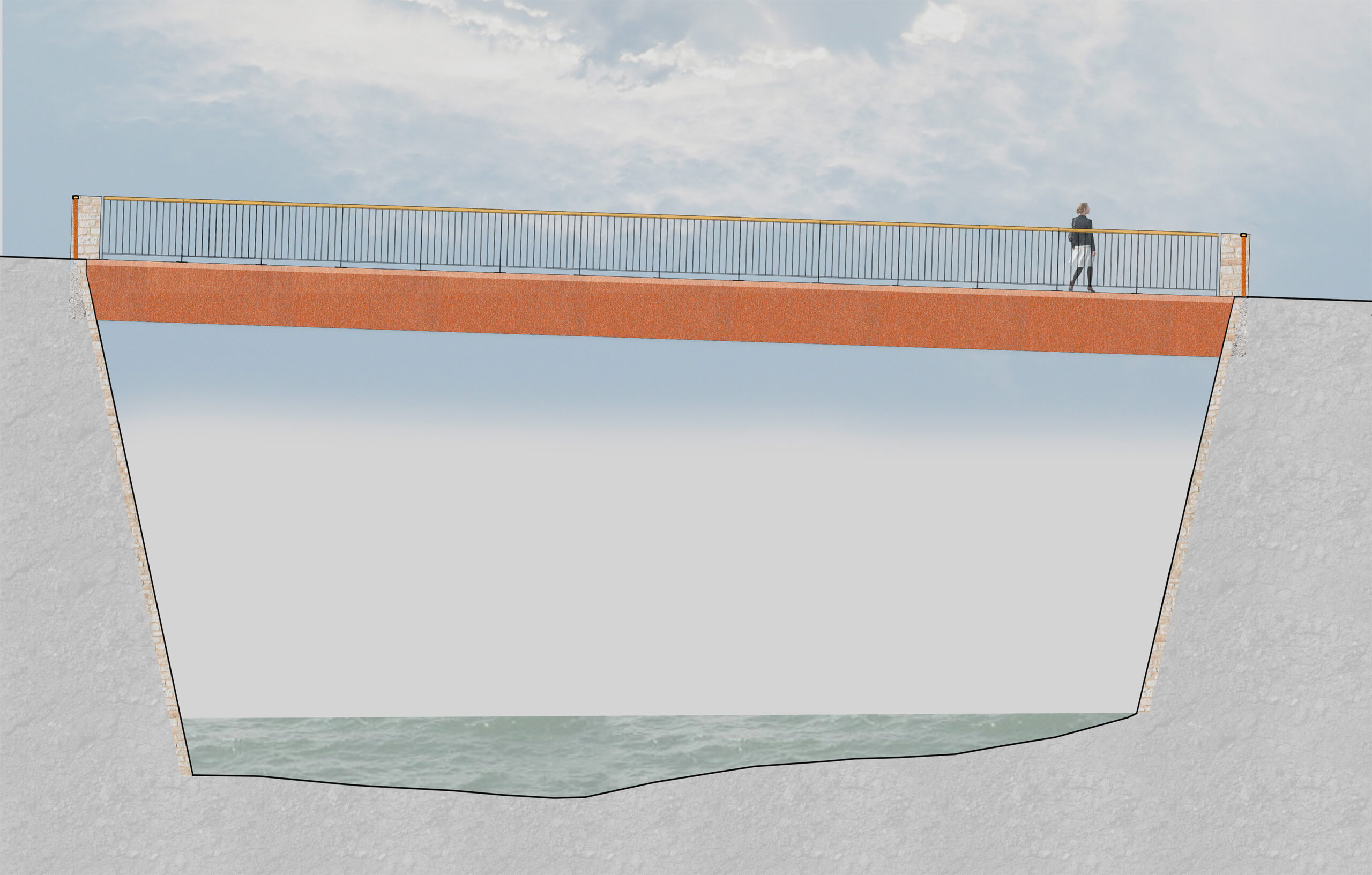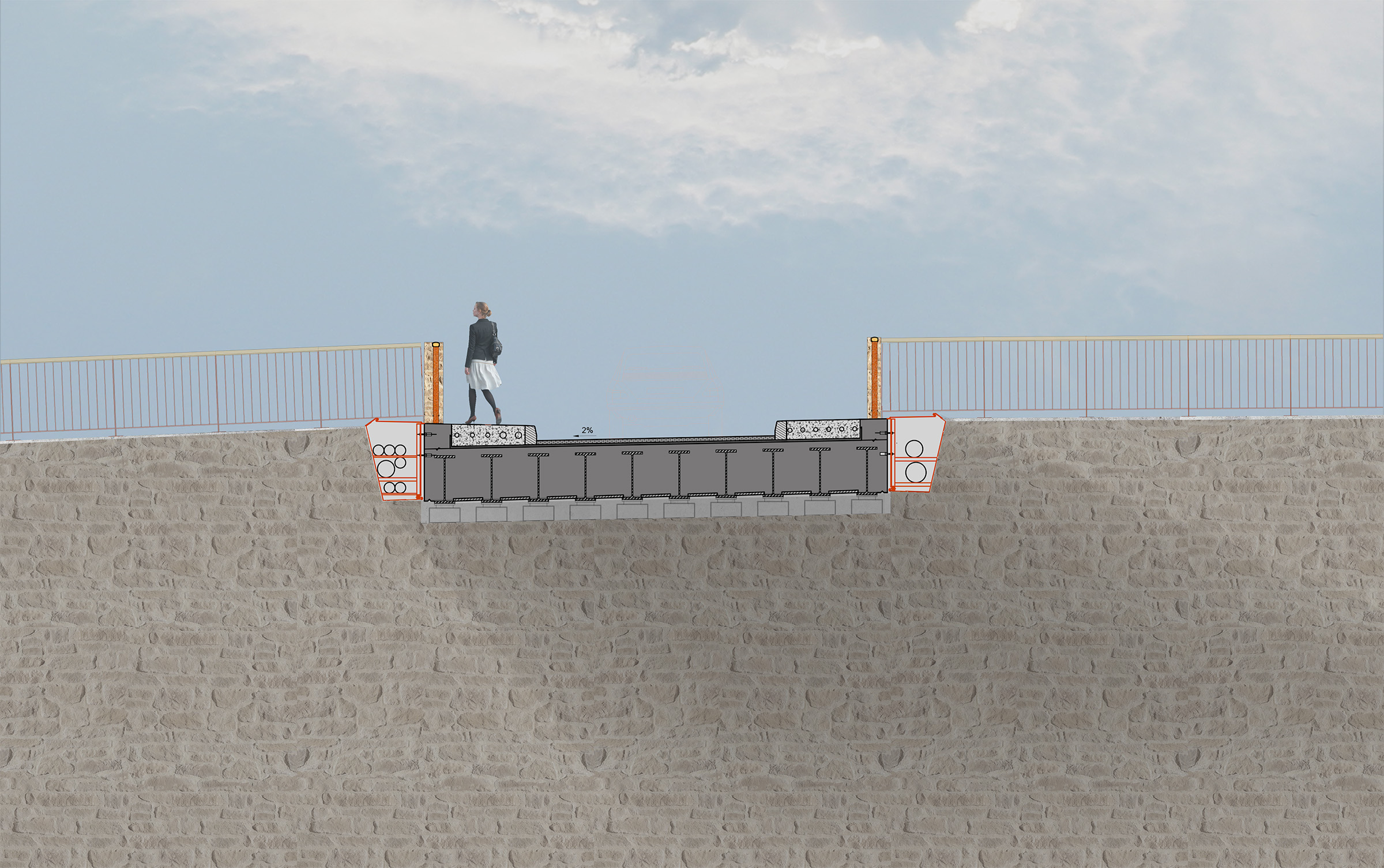 Nous proposons pour cet ouvrage une structure béton de type PRAD, d’une portée de 27 m et d’une largeur utile de 7 m. Le tablier est habillé d’une corniche en béton d’une hauteur de 90 cm. Les montants du garde-corps sont composés de plats métalliques en finition acier corten, d’une hauteur de 1,20 m. Les montants en plats d’acier ont une épaisseur de 20 mm.
